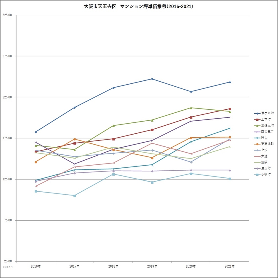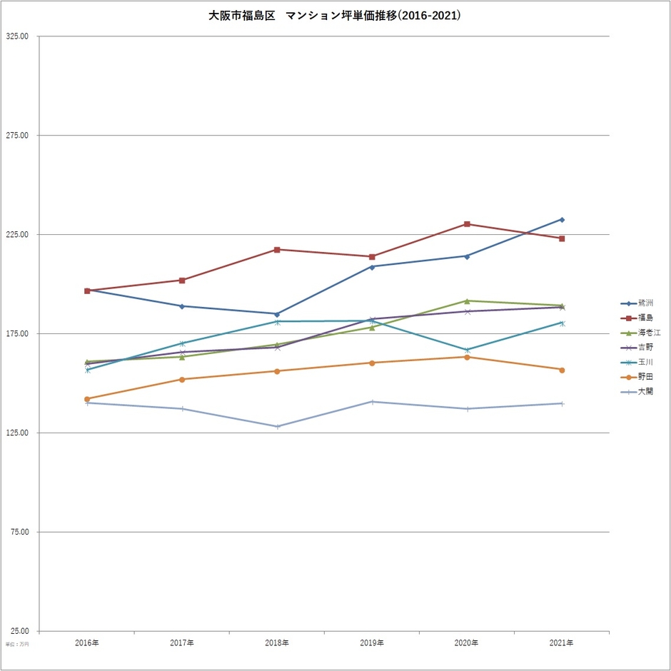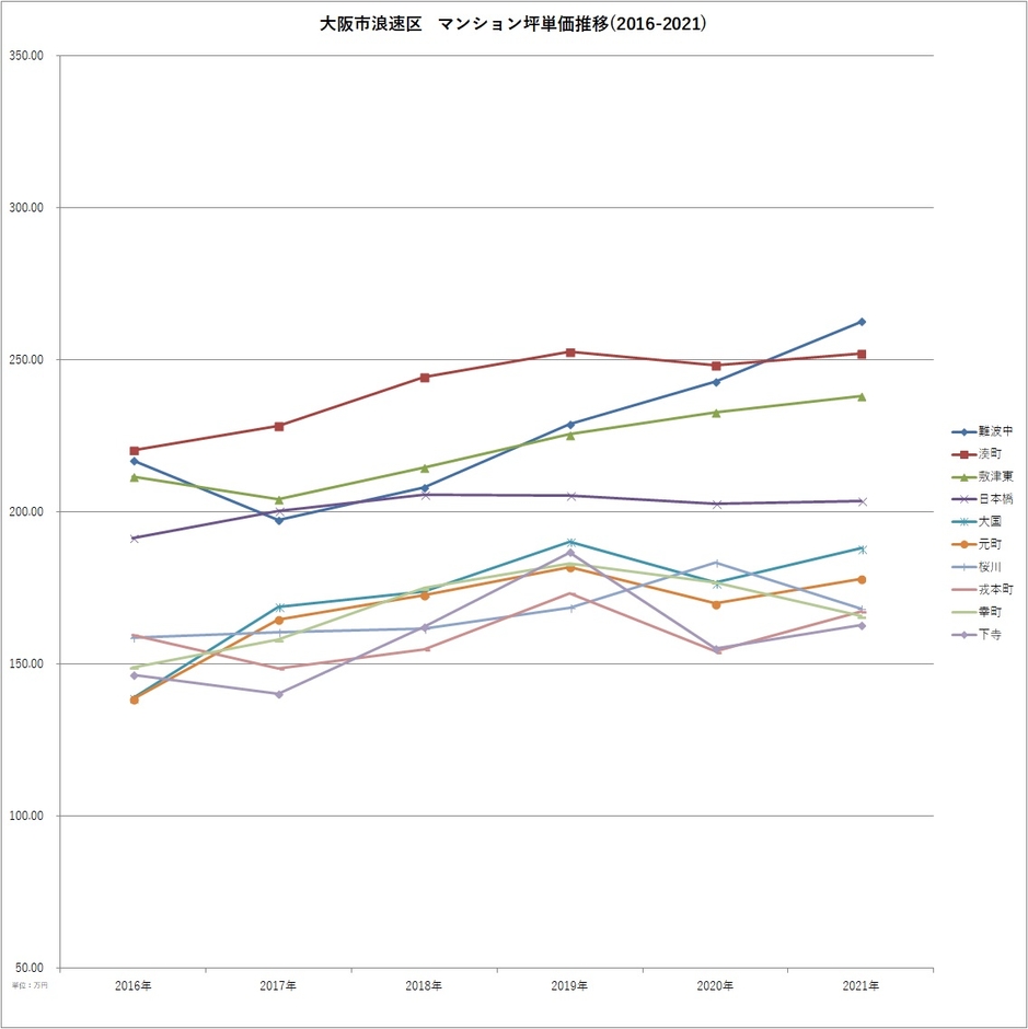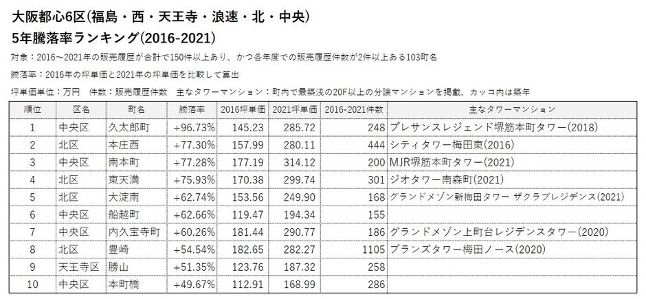 「不動産×WEB×ビッグデータ」の領域で、さまざまな不動産テックサービスを展開する株式会社ワンノブアカインド(本社:東京都港区、代表取締役社長:川島 直也、以下当社)は、当社が運営するマンション情報サイト「マンションレビュー」の保有データを元に、「大阪都心6区(福島区・西区・天王寺区・浪速区・北区・中央区」の各町名における、中古マンション相場および2016年からの相場推移について調査。最新の中古マンション価格*1とあわせて、2016年の坪単価と比較した騰落率のランキングを発表いたします。