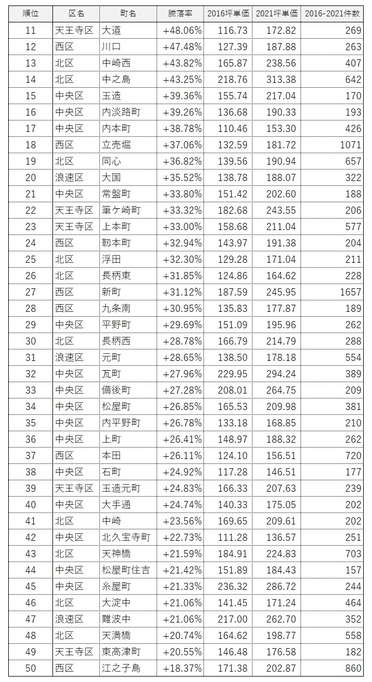 ・1位は「中央区久太郎町」の+96.73%。2016年と比較して、坪単価が約2倍弱まで上昇した。