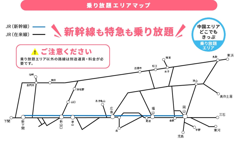 中国エリア自由周遊区間内のJR西日本線(新幹線・特急を含む)の普通車自由席が乗り放題です。