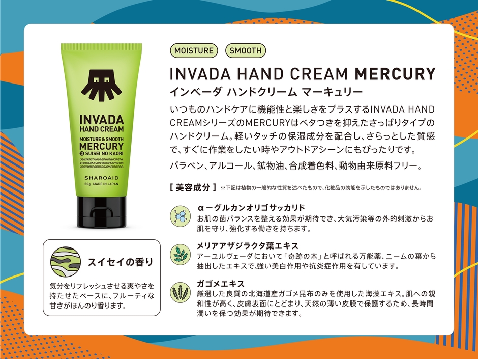 軽いタッチの保湿成分を配合し、さらっとした質感で、すぐに作業をしたい時やアウトドアシーンにもぴったりです。パラベン、アルコール、鉱物油、合成着色料、動物由来原料フリー。