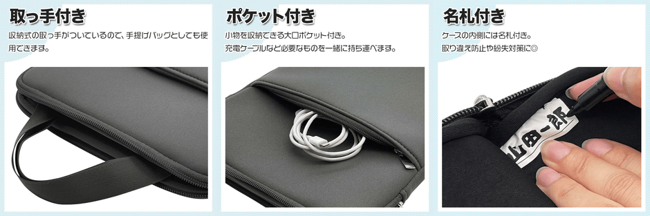 今回発売するタブレットケースは、クッション性のあるネオプレーン生地を採用し端末にピッタリとフィットし保護します。