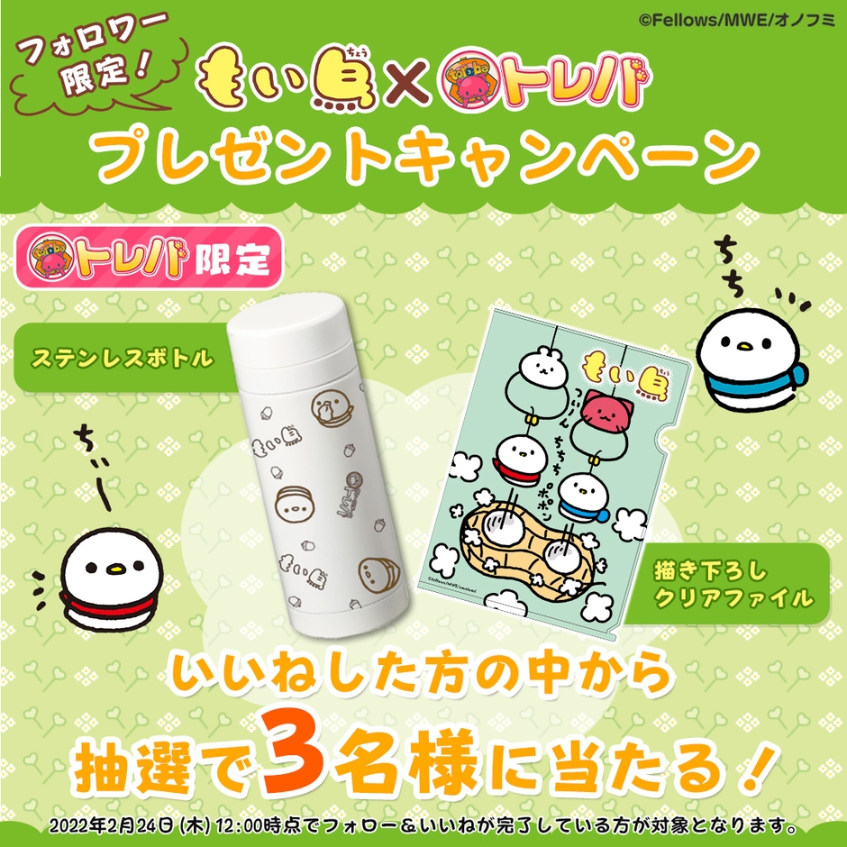 キャンペーンに関する投稿に「いいね」をしていただいたフォロワーの中から抽選で3名様に、「【トレバ限定】もい鳥 ステンレスボトル」と、「【トレバ限定】もい鳥 描き下ろしクリアファイル」をセットでプレゼント!