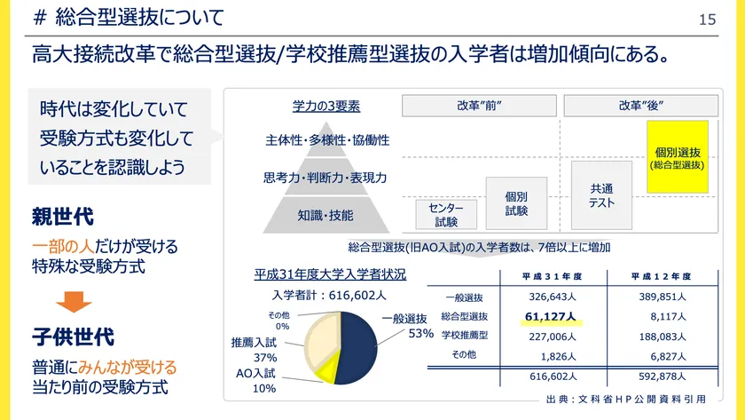 親世代では一部の人だけが受ける特殊な受験方式だと思っている人が多いようですが、1990年から始まった総合型選抜入試(旧:AO入試)は30年で7倍以上となり全国6万人もの受験生が受けています。子ども世代は普通にみんなが受ける当たり前の受験方式になってきているのです。
