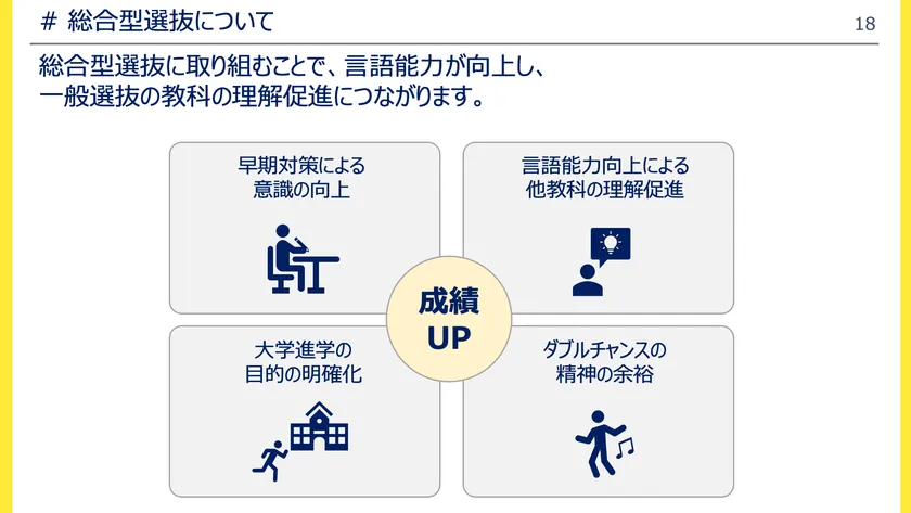 しかし、総合型選抜入試の認知度がまだ低いのが現状・・・だからこそ今がチャンスです。総合型選抜入試は一般選抜入試より倍率が半分になっているため志望校合格への可能性が上がります。また、一般入試と時期がずれているため早期に受験戦略を立てることでチャンスが2倍になります。総合型選抜入試に取り組むことで言語能力が向上し、一般選抜の教科の理解促進につながります。
