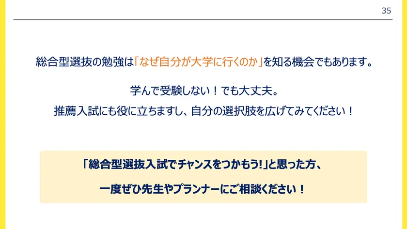 総合型選抜入試の勉強は「なぜ自分が大学に行くのか」を知る機会でもあります。学んで受験しない!でも大丈夫。推薦入試にも役立ちますし、自分の選択肢を広げてみてください。