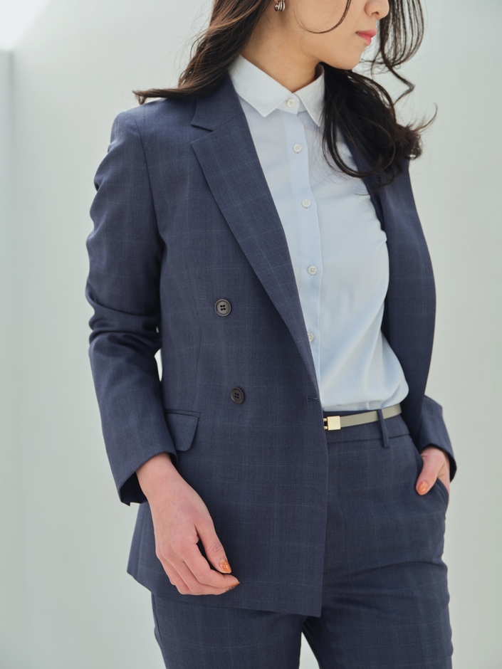 定番のダブルジャケットは、スーツスタイルにするだけで鮮度上昇。