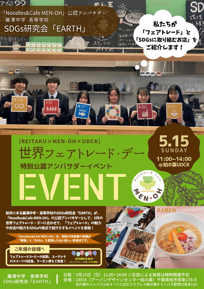 麗澤中学・高等学校(千葉県柏市/校長:櫻井 讓)のSDGs研究会「EARTH」が、地元ラーメン店「Noodles&Cafe MEN-OH」の公認アンバサダーとして5月の世界フェアトレード・デーに合わせ、フェアトレードの魅力やお店の魅力をSDGsの視点で紹介をするイベントを実施します。来場者はフェアトレードコーヒーの試飲やユーグレナのスイーツの試食をしながら参加できるイベントになっています。