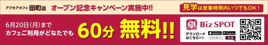 アクセアカフェ田町店の1時間無料キャンペーンを実施いたします。