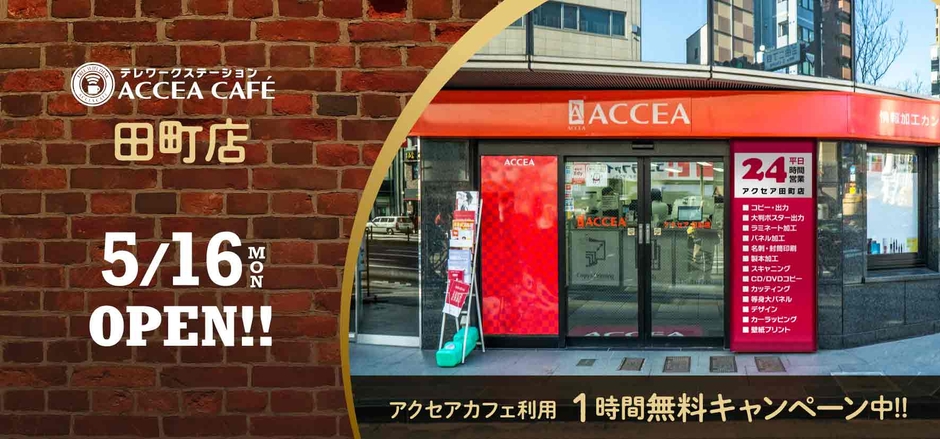 株式会社アクセア(本社:東京都千代田区、代表取締役社長:吉田忠司、以下アクセア)は、アクセア田町店にテレワークステーションACCEA CAFÉ(アクセアカフェ)を併設し5月16日(月)にリニューアルオープンいたします。オープンから6月20日(月)までアクセアカフェの1時間無料キャンペーンを実施いたします。