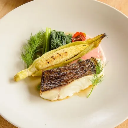 白身魚のグリル 野菜のソース+ポプラの前菜+ライスorパン+食後のお飲み物
