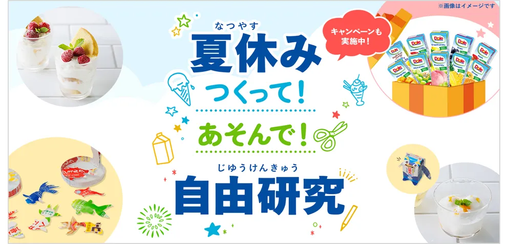 この特設ページは、夏休みの自由研究のテーマに迷う小学生のお子さまをサポートすべく、牛乳・乳製品をもっと身近に感じ、親しんでいただきながら取り組める、「ひんやりスイーツ」レシピや、おうちで夏祭り気分を楽しめる牛乳パック工作「おうちで夏祭り」などを紹介しています。