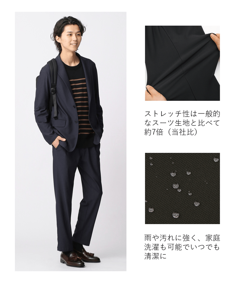 さらに、『ゼロプレッシャースーツ』は着用時の圧迫感(着圧)が極めて少なく、裏地・芯地・ 肩パッドなどの付属を可能な限り省くことで、これまでにない“解放的”な着用感を実現。このようなストレスフリーな着心地に加えて、スーツはシワになりにくいのも特徴で、撥水性があり雨や汚れに強く、自宅の洗濯機で丸洗いも可能となっているなど高いイージーケア性を備えています。