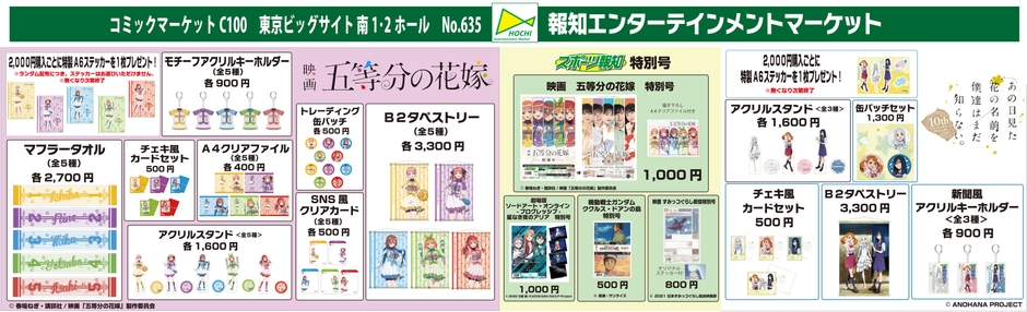 報知新聞社(代表取締役社長・依田裕彦)が運営するアニメ・サブカルグッズ専門ECサイト「報知エンターテインメントマーケット(H.O.E.M)」(https://hochi-em.myshopify.com/)は東京ビッグサイトで8月13、14日に行われる世界最大級の同人誌即売会「コミックマーケット100」(通称:コミケ)に出展します。当社の出展は2019年以来3年ぶり。場所は南1・2ホールNo.635。ブース内では人気アニメ「あの日見た花の名前を僕たちはまだ知らない。」と「五等分の花嫁」のオリジナルグッズを発売します。いずれも報知新聞社が発行したタブロイド新聞「あの日見た花の名前を僕達はまだ知らない。10周年特別号」と「映画 五等分の花嫁特別号」のために描き下ろされたイラストを使用した貴重な商品をコミケ会場価格にて販売。また、初音ミク15周年と報知新聞150周年を記念し10月に発売を予定、ECサイト「H.O.E.M」で予約を開始した画集「TABLOID MIKU」のサンプル展示も行っています。