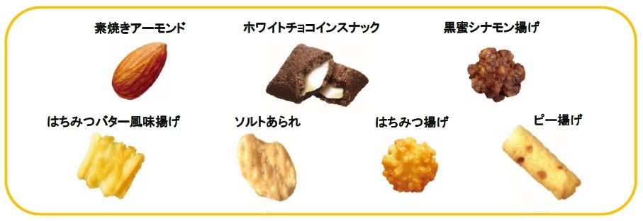 カリっとローストした香ばしい「素焼きアーモンド」、ビターなココア生地にホワイトチョコクリームが入った「ホワイトチョコインスナック」をはじめ、黒糖とシナモンの風味がふわっと香る「黒蜜シナモン揚げ」、はちみつの甘さとバター風味がおいしい「はちみつバター風味揚げ」、ツブツブ食感がクセになる「ソルトあられ」、優しい甘さの「はちみつ揚げ」、ピーナッツが香ばしい「ピー揚げ」といった個性豊かでバラエティ豊かな7種のおいしさを、1個包装で味わえます。