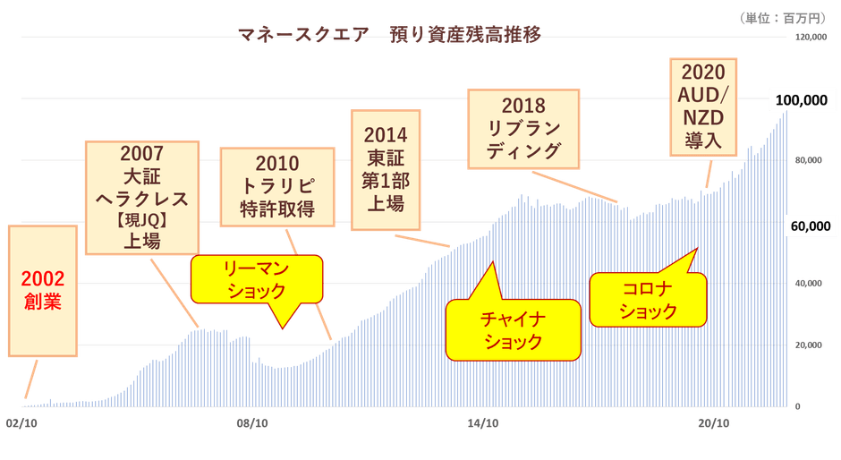 株式会社マネースクエア(本社:東京都港区、代表取締役社長:藤井 靖之、以下「当社」といいます。)は、この度FX取引とCFD取引の預り資産残高の合計額が、2022年11月8日時点で、初めて1,000億円に到達いたしましたのでお知らせいたします。