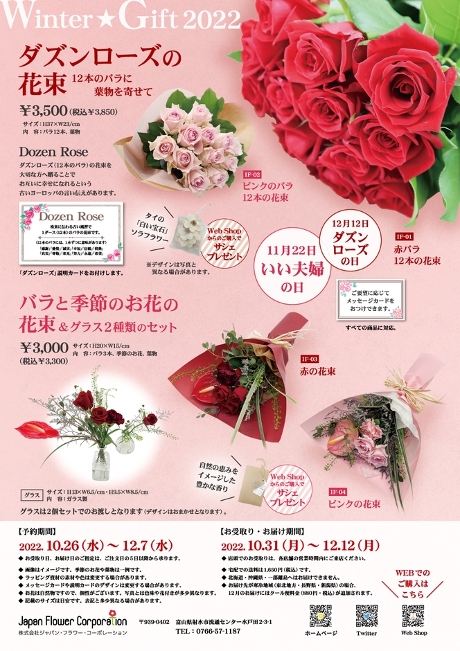北陸三県(富山、石川、福井)でフラワーショップ花まつを展開する株式会社ジャパン・フラワー・コーポレーション(本社:富山県射水市、代表取締役社長:松村吉章、以下「JFC」)は、バラの花束をメインとした初冬のギフトシーンを彩る花まつオリジナル「ウィンターギフト2022」をご用意いたしました。