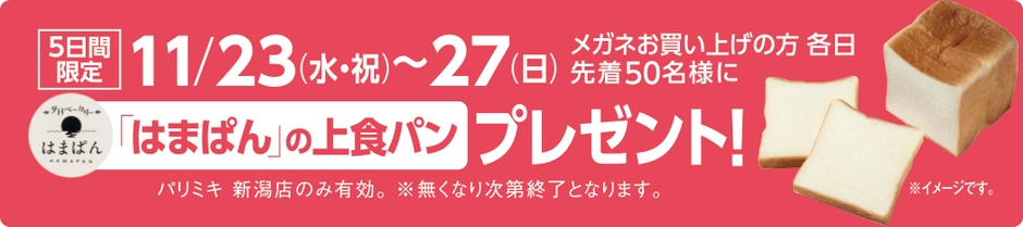 オープンを記念し11/23(水・祝)~27(日)の5日間、メガネをお買い上げの方 各日先着50名様に、「はまぱん」の上食パンをプレゼント!