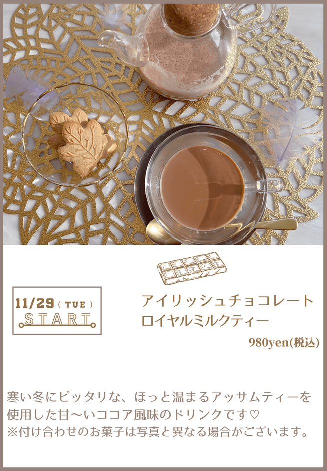大人気ドリンクのアイリッシュチョコレートロイヤルミルクティーのホットバージョンと、ジンジャーを使用した、体を芯から温めてくれるハーブティーをご用意しました。