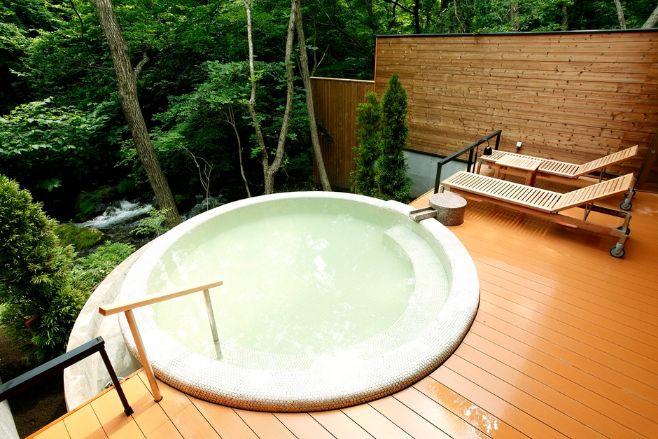 クリやコナラの自然林に抱かれ、眼前には渓流「小阿寺沢」が流れるロケーションにあり窓の外の景色を楽しみながら入れるのも嬉しいポイント。