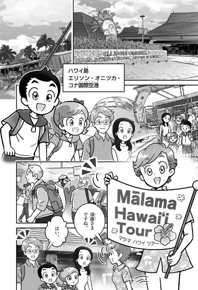 新婚旅行でハワイを訪れたことのある両親と、ハワイへ行ったことがない兄と妹の4人家族が夏休みにハワイ旅行を計画します。旅行を何十倍も楽しく、学びの多い旅にしようとハワイについて調べた父は、レスポンシブルツーリズムをテーマにしたマラマハワイツアーに家族で参加することにしました。家族はハワイ島の植物園でハワイの植物について学び、ハワイの固有種であるコアの森では植樹体験をします。続き訪れたビーチでは、海の環境に配慮した成分の日焼け止めを使用することや、海洋動物を観察する際のルールを学びます。その後、ハワイ火山国立公園を訪れて火山や地質について知るほか、ハワイ島の気候帯や、天体・星座について学びます。さらに家族はオアフ島へ。イオラニ宮殿やパールハーバーを訪れてハワイと日本の近代史を学んだあと、食文化やメイドインハワイのお土産が買えるファーマーズマーケットにも立ち寄り、五感でハワイを体感しながら多くの新しいハワイを探求する旅を満喫します。