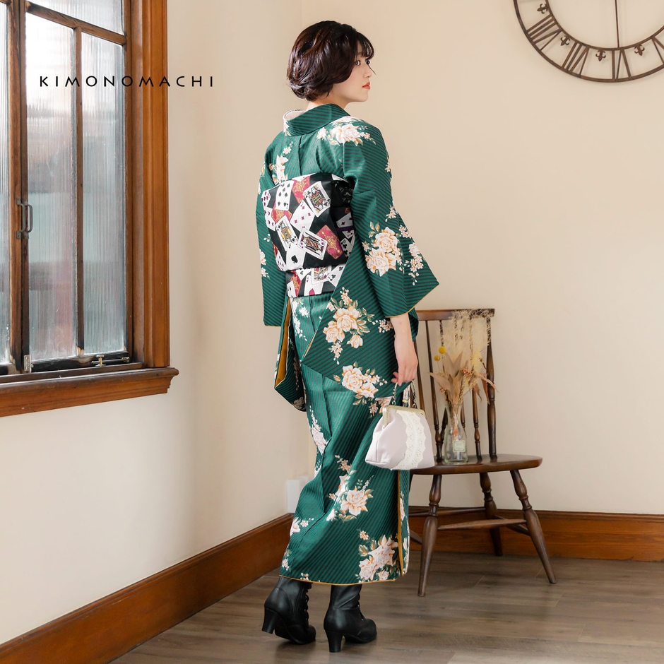 青みの深緑に黒の斜めストライプの地、白にベージュ、キャメルのバラのブーケが飛び柄で表現されたスタイリッシュなデザイン。裏地は山吹茶。