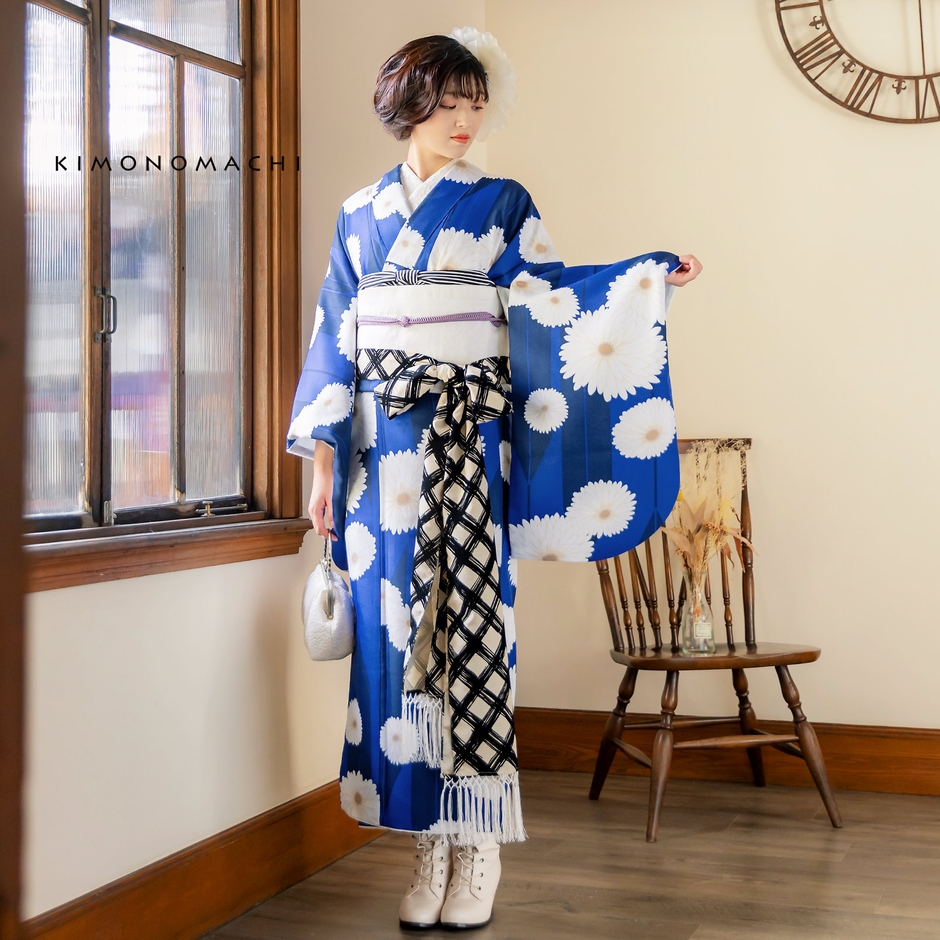 あざやかな青の地に紺の矢羽根、白に淡いベージュのぼかしの大小の菊の花。ハッキリと冴えた色合いとアンティーク調の大胆な柄行が魅力です。裏地はオフホワイト。