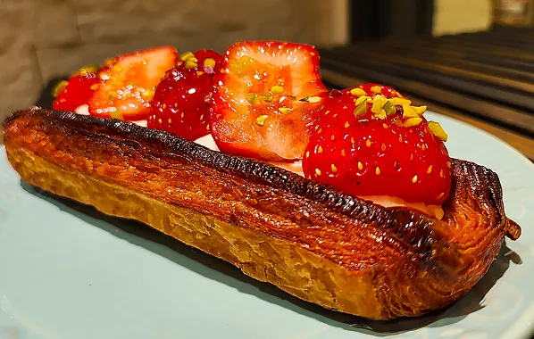 約5年半パン職人として渡仏経験のあるシェフが、2015年にオープンしたお店。ザクザクのデニッシュ生地にアガーでコーティングした「とちあいか」をのせたデニッシュ。
