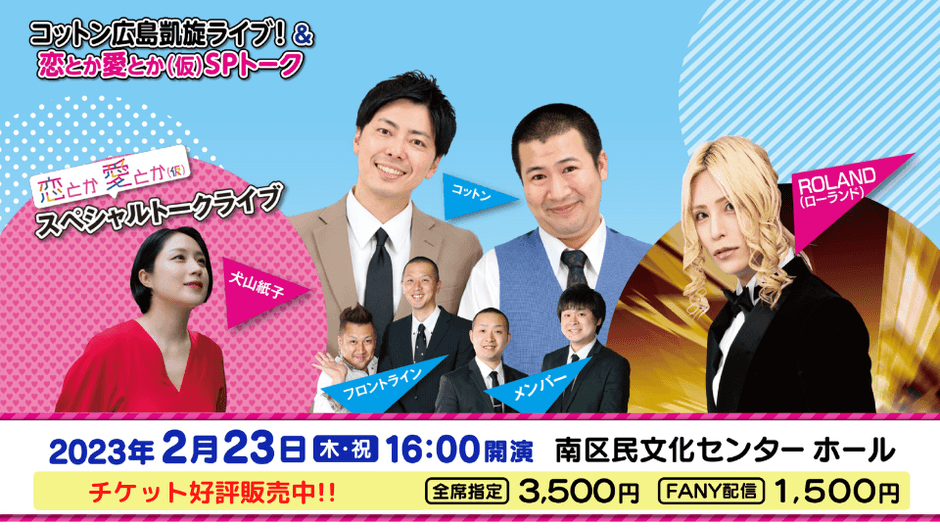 広島ホームテレビ(所在地:広島県広島市)は、主催で2023年2月23日(木・祝)『コットン広島凱旋ライブ!&恋とか愛とか(仮)SPトークショー!!』を広島市南区民文化センターで開催いたします。