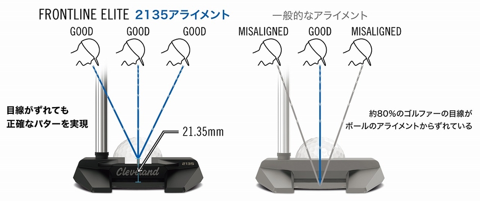 トップブレードの高さをゴルフボールの中心である21.35mmに設定することで目線がボールの手前や先にある場合でも、常にボールの中心に合わせた正確で再現性の高いアドレスを実現します。