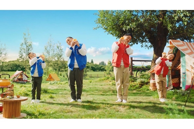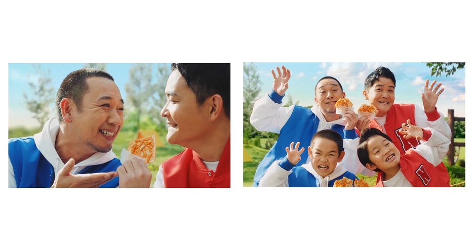 千鳥と、本人にそっくりな小千鳥が、テントの近くで「亀田の柿の種」を持って、なにか作ろうとする様子から始まる今回のCM。フライパンで加熱して、ふつふつとしたスライスチーズの上にパラパラと「亀田の柿の種」をかけて出来上がった「柿の種チーズせんべい」。大悟さんがノブさんへ「どうぞぅ」と勧めると、そのおいしさに「カリッとうまし!」と感動する4人。思わず試してみたくなる、シズル感たっぷりなCMカットが印象的です。