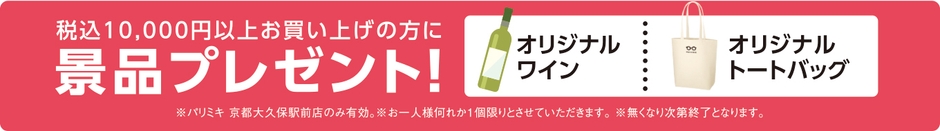 オープンを記念し、税込10,000円以上お買い上げの方に、パリミキオリジナル「トートバッグ」「ワイン」の何れか1つをプレゼント!