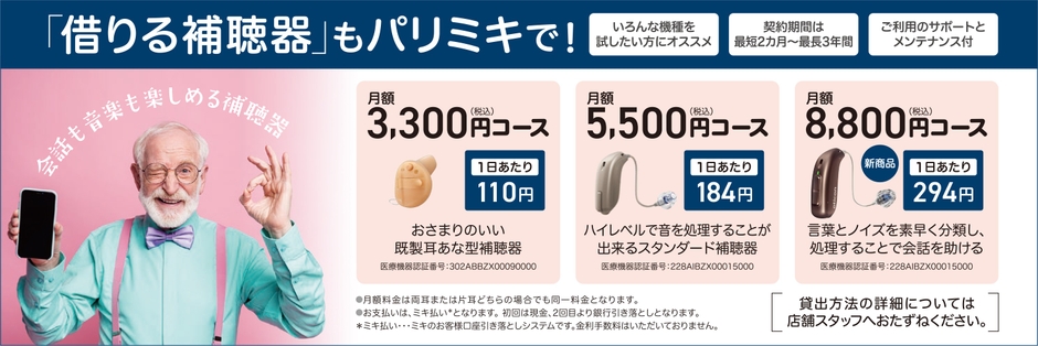 月額税込3,300円~ 定額にて補聴器を貸し出しいたします。使えるようになるか不安な方は、まずは補聴器を借りることから始めてみませんか? また、ご購入をご希望の場合は両耳84,000円(非課税)~ お求めいただけます。