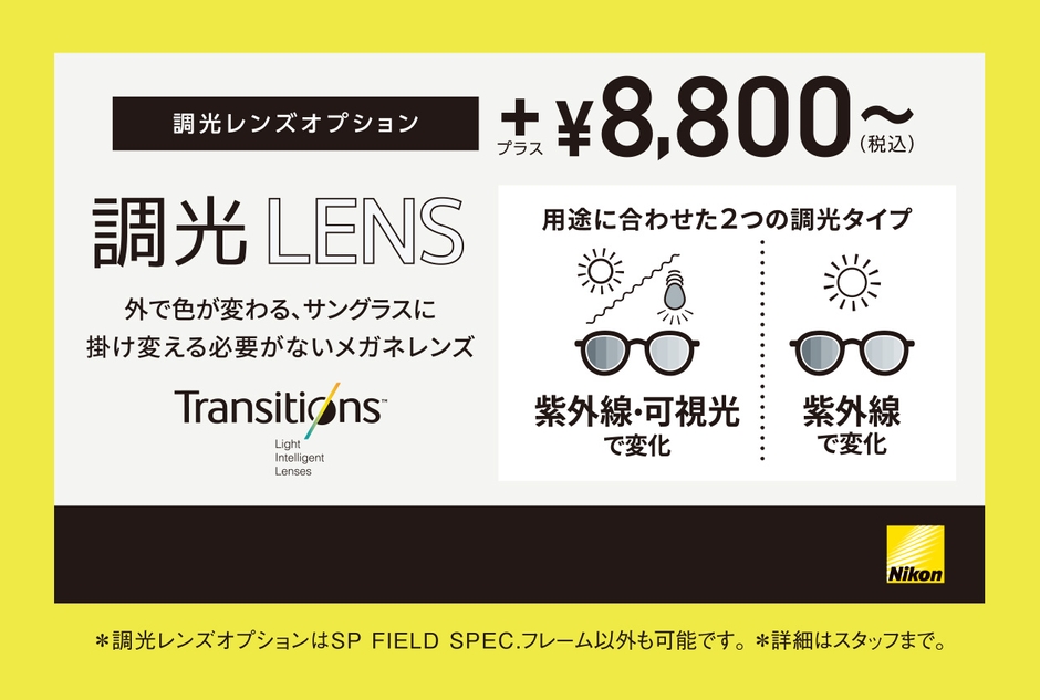 スポーツメガネの機能を詰め込んだ、普段使いできるアイウェア「SP FIELD SPEC.」フレームと、外で色が変わり、サングラスに掛けかえる必要がないメガネレンズ「Nikon トランジションズ」の組み合わせで、春の行楽シーズンに大活躍間違い無しのメガネをご提案いたします。
