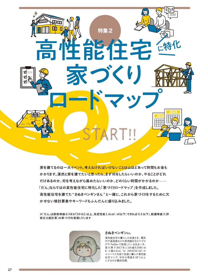 「だん」ならではの高性能住宅に特化した「家づくりロードマップ」を作成しました。高性能住宅を建てた”さぬきぺんぎん”さんと一緒に、これから家づくりをするために欠かせない検討要素やキーワードをふんだんに盛り込みました。