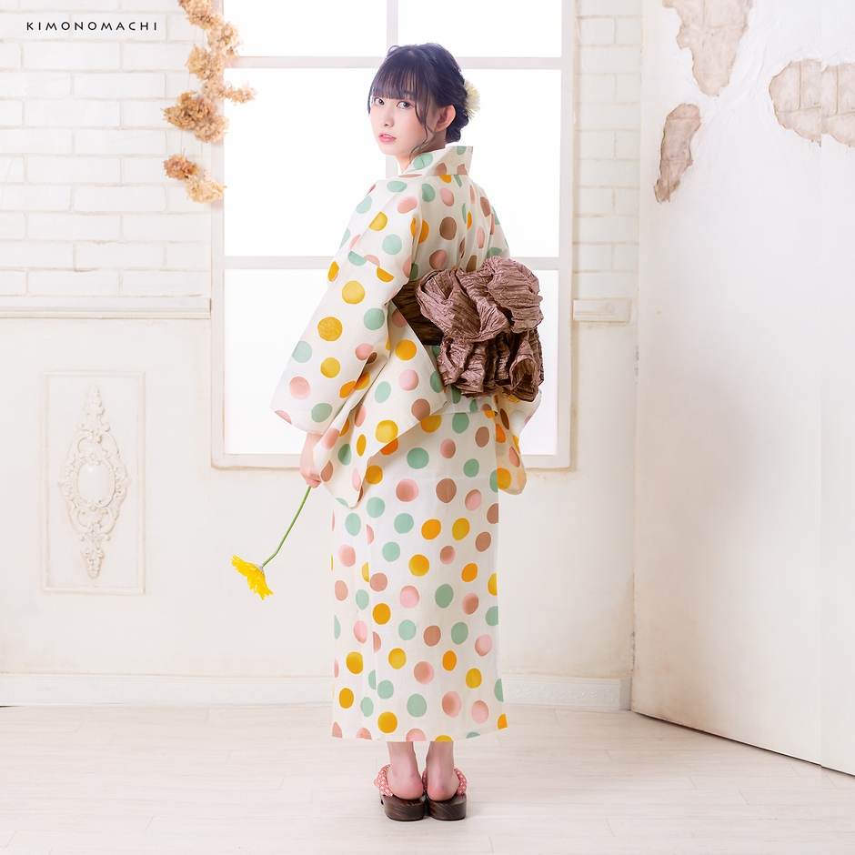 淡い生成り色の地に、ランダムな水玉模様。深い山吹色に淡黄色のぼかしや、グレーの濃淡、淡い藤色。手描き調のやわらかな形がかわいらしく、シックな色彩が大人びた印象にしてくれます。