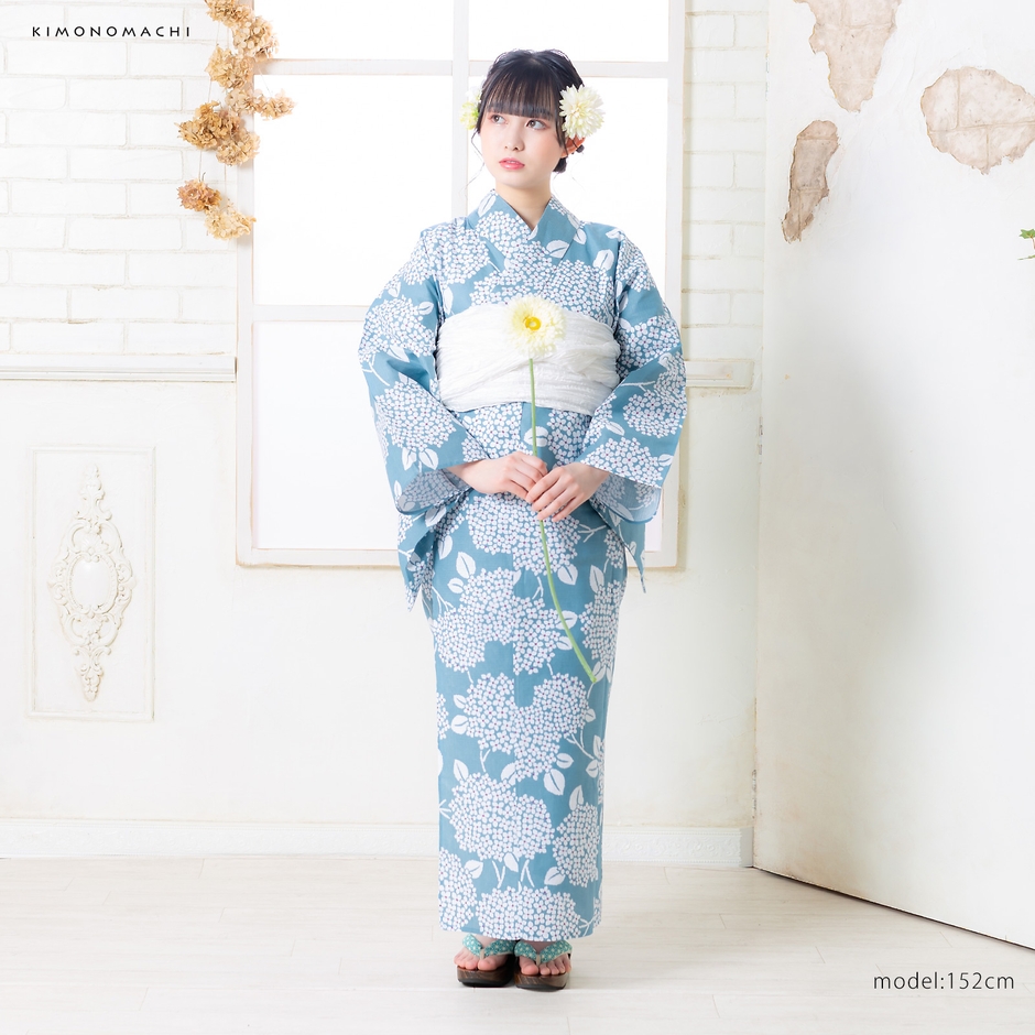 グレイッシュな淡いブルーの地に、白のあじさいの花模様。花芯の赤紫がポイントです。現代的なスモーキーカラーに、型染め風の輪郭線のないデザインが、レトロな可愛らしさです。