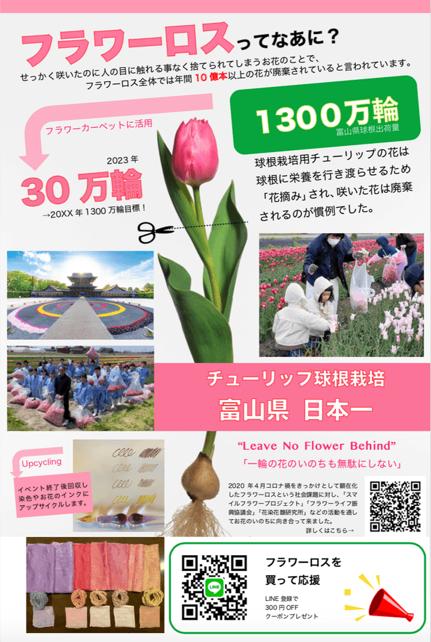 ④ 毎年の取り組みとして広く協力を募り、順次規模を拡大して春の富山を代表する催しへと成長させることで、県内球根栽培用のチューリップ1300万輪全ての花を廃棄する事なく、活用してゆくことを目指す。
