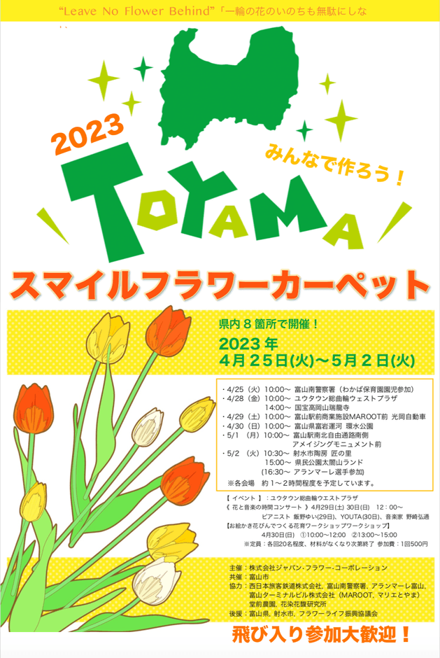 「2020スマイルフラワープロジェクト」を立ち上げ「フラワーロスの削減と花農家の積極支援」に取り組む株式会社ジャパン・フラワー・コーポレーション(本社:富山県射水市、代表取締役社長:松村吉章、以下「JFC」)は、4月25日(火)〜5月7日(日)の期間、富山の県花であるチューリップで色鮮やかなフラワーカーペットを創る市民参加型イベント『TOYAMA SMILE FLOWER CARPET 2023』を県内各所で開催いたします。