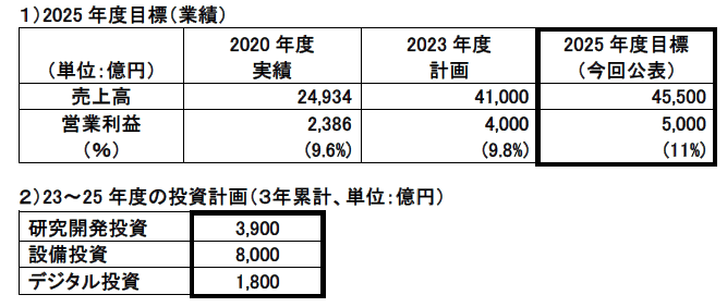 このたびFUSION25後半3ヵ年計画では、前半の成果や事業環境の変化を踏まえて、2025年度における定量目標を売上高4兆5,500億円、営業利益5,000億円(営業利益率11%)と設定しました。