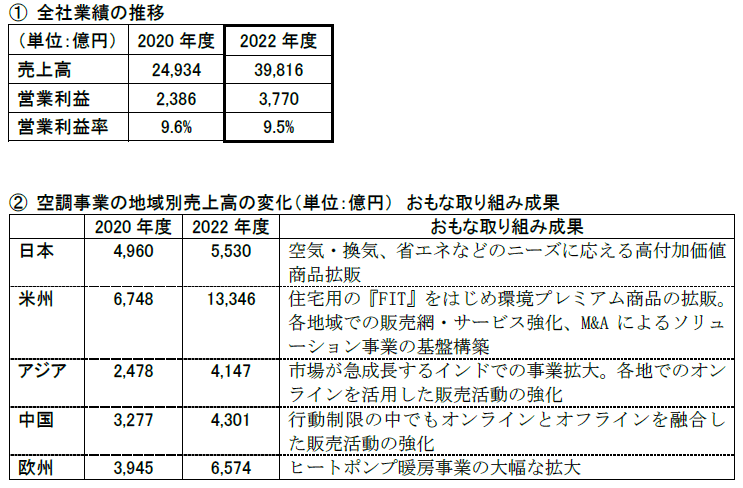 ・カーボンニュートラルの実現においては欧州のヒートポンプ暖房事業の拡大や、米国やアジアなどでインバータ化の加速に向けた仕組み作りを進めた。そのほか、ソリューション事業の強化に向けた事業基盤の強化、北米での空調事業の拡大、強靭なサプライチェーンの構築を進めている。