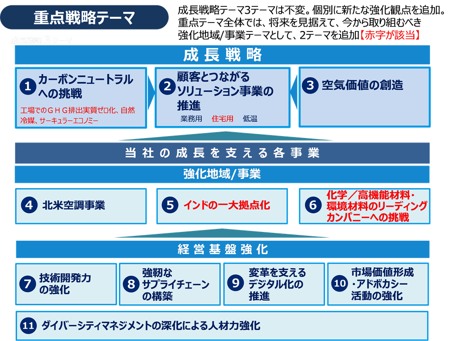 また、重点戦略テーマとして「カーボンニュートラルへの挑戦」や「顧客とつながるソリューションの強化」、「空気価値の創造」「北米での空調事業拡大」など当初から掲げる9テーマに、「インドの一大拠点化」など新たに2テーマを加えました。これらの重点戦略テーマを深掘りし実行していくため、研究開発や生産能力の増強など、今後3年で約1兆2,000億円の投資を行い、時代の変化に対応しより大きく事業を拡大させる計画です。