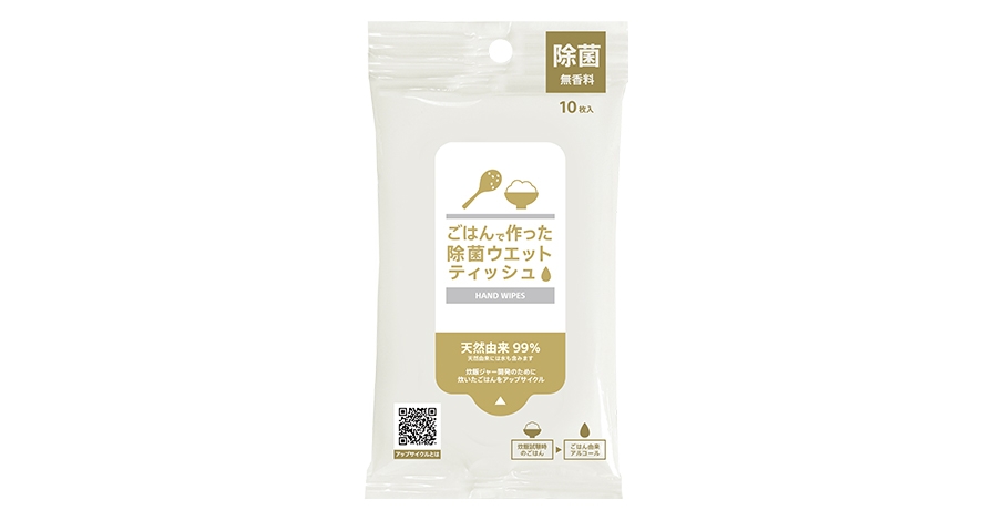 象印マホービンでは、2021年に、持続可能な社会に向けたサーキュラエコノミー(循環型経済)の実現を目指し、炊飯ジャーを開発する際に炊飯試験で炊いたごはんを原料に発酵アルコール(エタノール)を精製した天然由来成分99%の「ごはんで作った除菌ウエットティッシュ」を商品化しました。