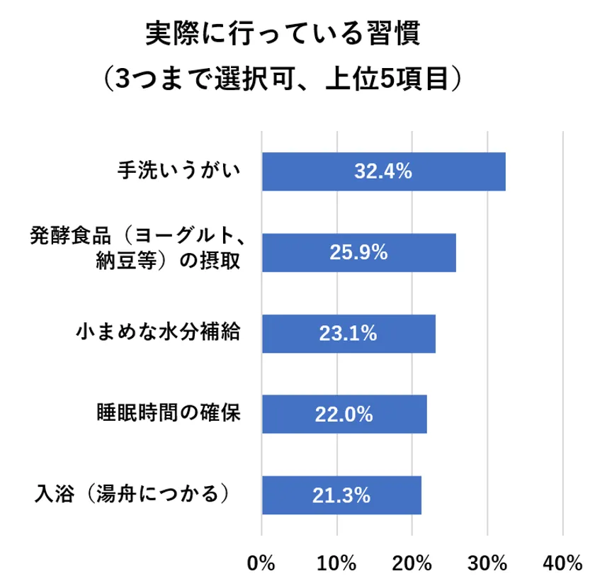 ・反対に対策として行っていることとして、1位「手洗いうがい」(32.4%)、2位「発酵食品の摂取」(25.9%)、3位「小まめな水分補給」(23.1%)が選ばれた(Q8)