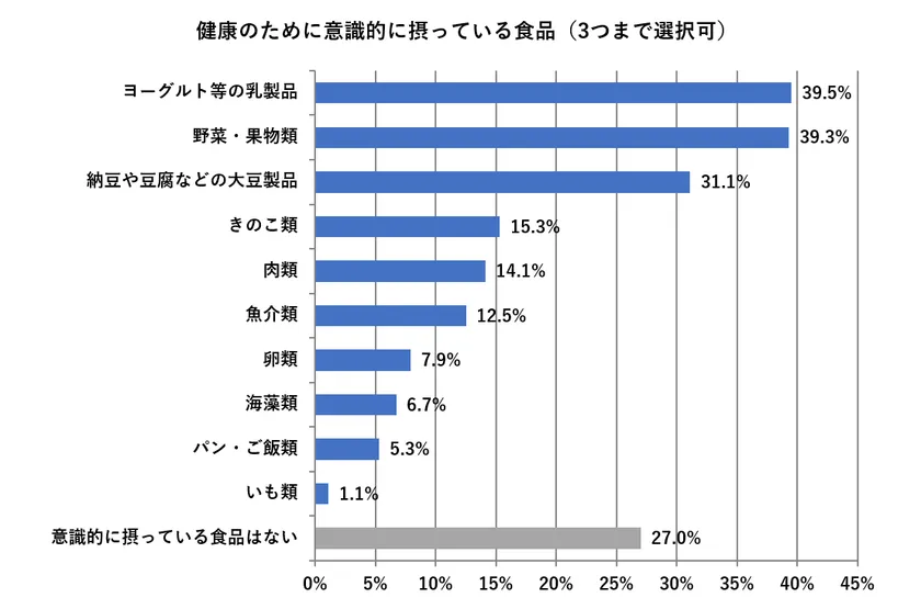 ・世の中の人が健康のために摂っている食品1位は「ヨーグルトなどの乳製品」(39.5%)、2位「野菜・果物類」(39.3%)、3位「納豆や豆腐などの大豆製品」(31.1%)だった(Q9)