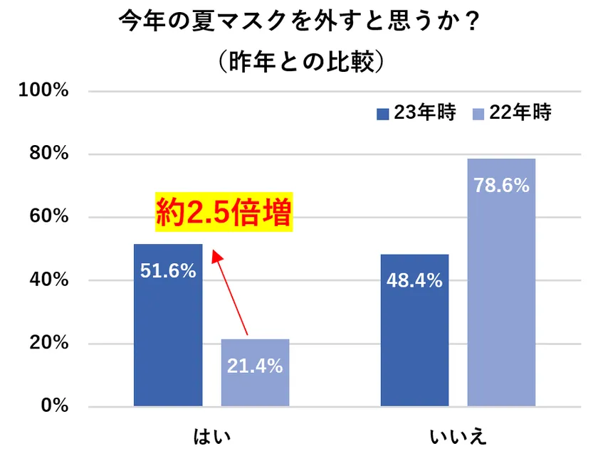 [一般生活者1,000人を対象としたマスク着用実態調査] 今夏「マスクを外す」と答えた人は51.6%、昨年から2.5倍増 20代~30代は5割を超え、若い世代でマスク離れが顕著に 専門家はマスク着用自由化以降の「口腔リスク」を危惧