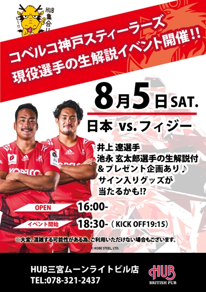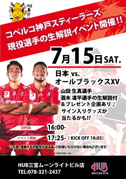 株式会社ハブ(本社:東京都千代田区、代表取締役社長:太田 剛)が運営するHUB三宮ムーンライトビル店は、昨年、ご好評をいただきましたコベルコ神戸スティーラーズの現役選手によるリアルタイム解説イベントを、今年も開催いたします。