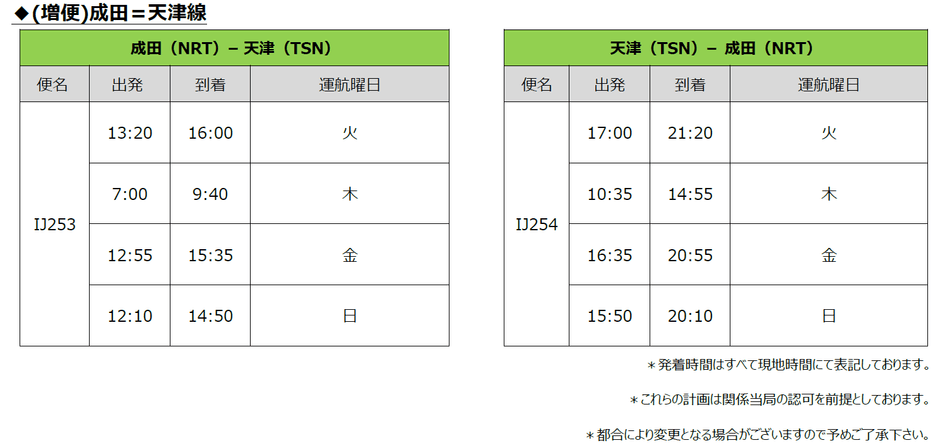 2023年7月10日 15:00スプリング・ジャパン株式会社(本社:千葉県成田市、代表取締役社長:米澤 章、以下:スプリング・ジャパン)は、2023年9月~10月の国際線の増便および国内線の運航を以下のとおり決定し、本日7月10日(月)16時より販売を開始いたします。今回の増便により、国際線は成田=ハルビン線、寧波線、天津線いずれも毎日運航となります。