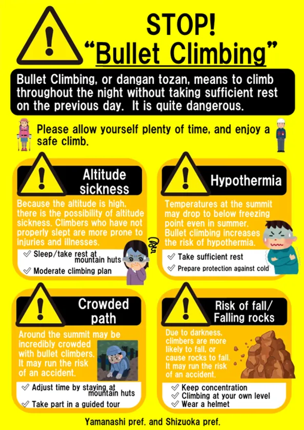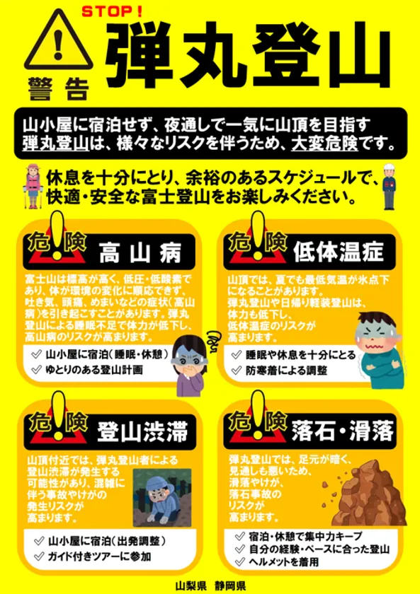 高山病や低体温症等のリスクにつながる夜間弾丸登山の自粛を呼びかけるため、山梨・静岡両県で、「STOP!弾丸登山」チラシを作成しました。チラシは、ツアー会社、登山用品店を中心に配布し、登山者に広く周知しています。