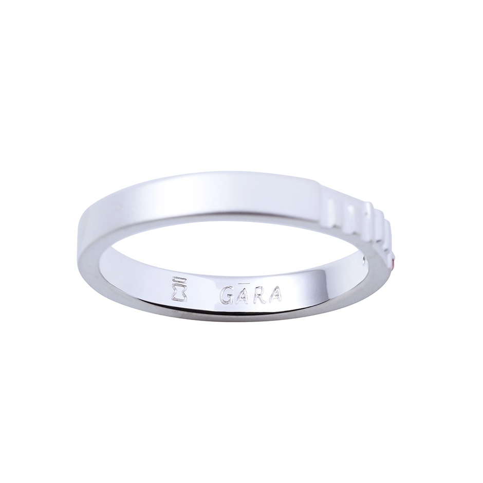 ストレートフォルムのリングに額の愛やひょうたんのマークをモチーフに取り込んだデザイン。