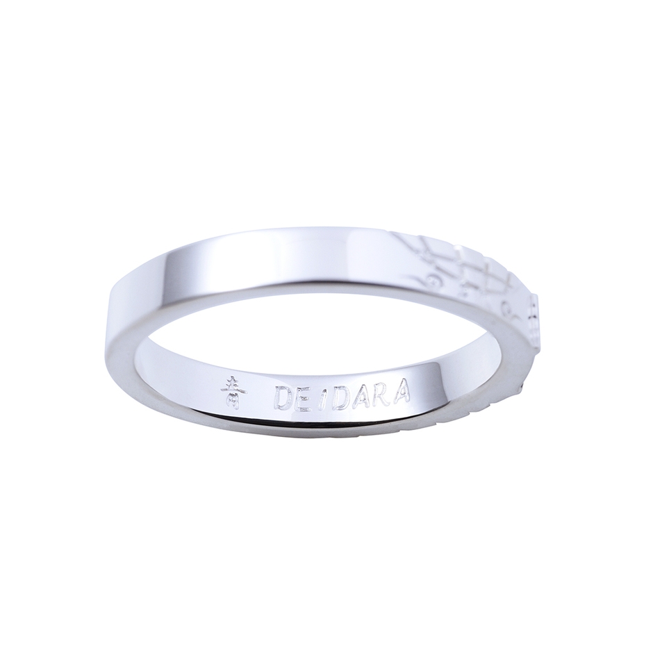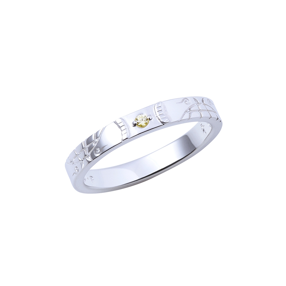 ストレートフォルムのリングに掌の口や体の模様をモチーフに取り込んだデザイン。